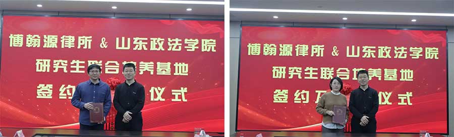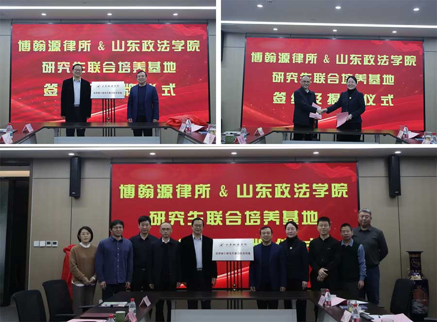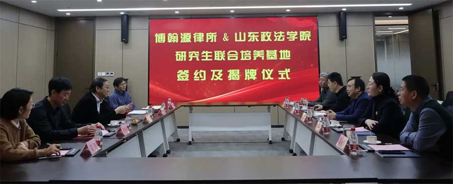 12 月 23 日上午,山东政法学院副校长窦衍瑞一行到访我所,双方共同举办 “山东博翰源律师事务所&山东政法学院研究生联合培养基地”签约暨揭牌仪式。山东政法学院研究生处党总支书记、处长肖立梅,经济贸易法学院院长刘万啸、副院长綦书纬,研究生秘书处胡枫等代表;我所合伙人会议主席霍建平律师,党支部书记、负责人陈明律师,合伙人高建军律师、何新华律师、苗珂律师等共同出席本次活动。